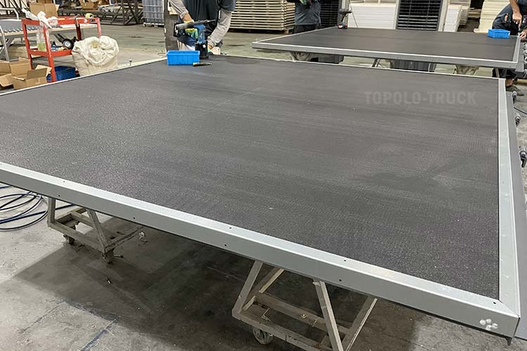 Another point is that vehicles also have high requirements on the hardness of the floor. Usually, thicker FRP sheets are used as the skin material. Sometimes a layer of plywood or other rigid foam(PET/PU) is added inside the panel near the upper layer in order to carry more weight. Anti-slip aluminum sheets or aluminum ducts are laid on the composite panel.