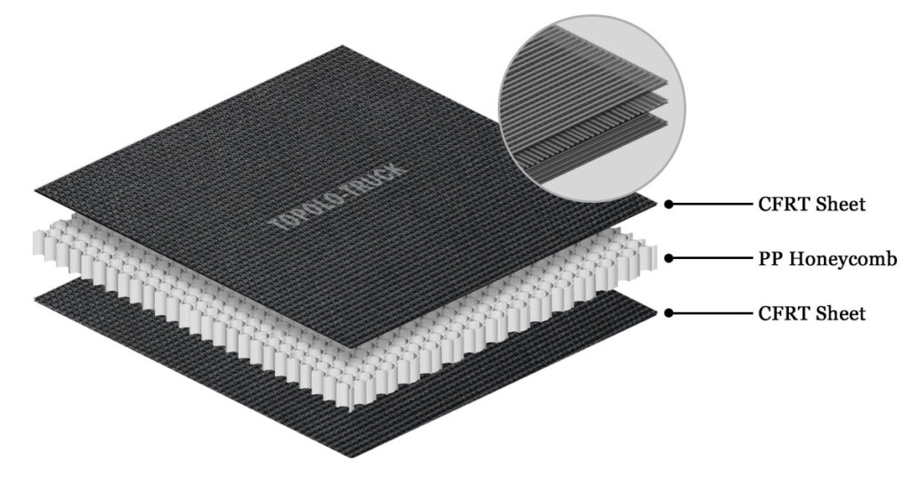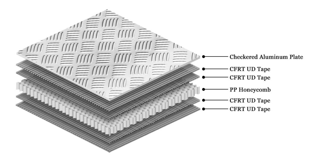 Lightweight thermoplastic honeycomb panels represent a typical example of modern composite materials. The panel structure consists of CFRT (Continuous Fiber Reinforced Thermoplastic) skins bonded to a polypropylene (PP) honeycomb core, forming a high-strength thermoplastic sandwich panel. The surface features a specially designed anti-slip texture, making it particularly suitable for cargo loading areas that require both safety and durability.