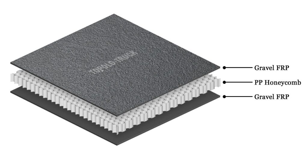 Gravel-textured FRP facing PP honeycomb panels are a high-performance composite flooring solution designed to simulate the anti-slip performance of real gravel surfaces. The panel is manufactured by bonding gravel-pattern FRP (Fiberglass Reinforced Plastic) sheets with a polypropylene honeycomb core, resulting in a lightweight yet highly durable flooring material. The unique gravel texture significantly increases friction, making it ideal for cargo trucks that frequently transport heavy goods, machinery, or pallets.