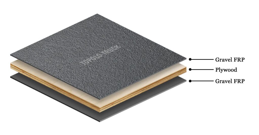 Gravel facing plywood panels are produced by bonding gravel-textured FRP sheets with waterproof plywood cores, combining the rigidity of plywood with the anti-slip performance of FRP surfaces. This flooring solution offers a cost-effective and reliable option widely used in cargo truck bodies and utility vehicles.